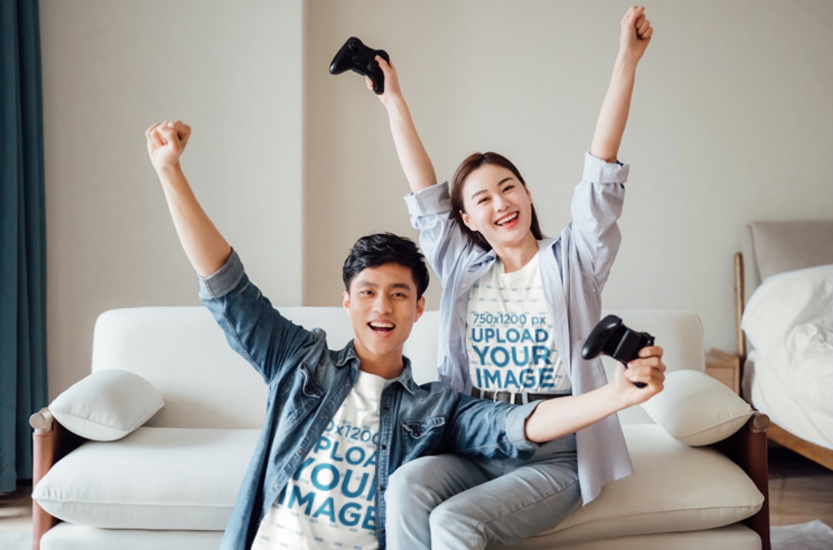T-Shirt Mockup Featuring A Happy Couple Playing Games